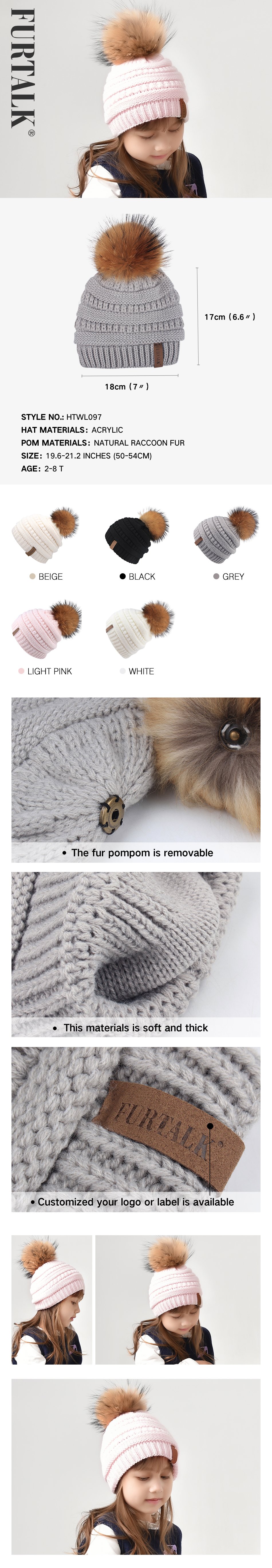 This cuffed pom beanie is knit in natural and colorful colors and with the Furtalk logo, and one detachable faux fur poms.