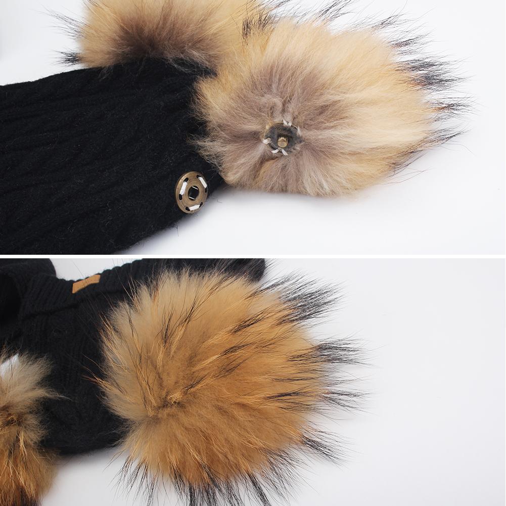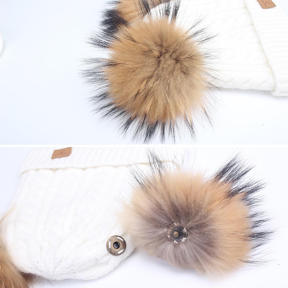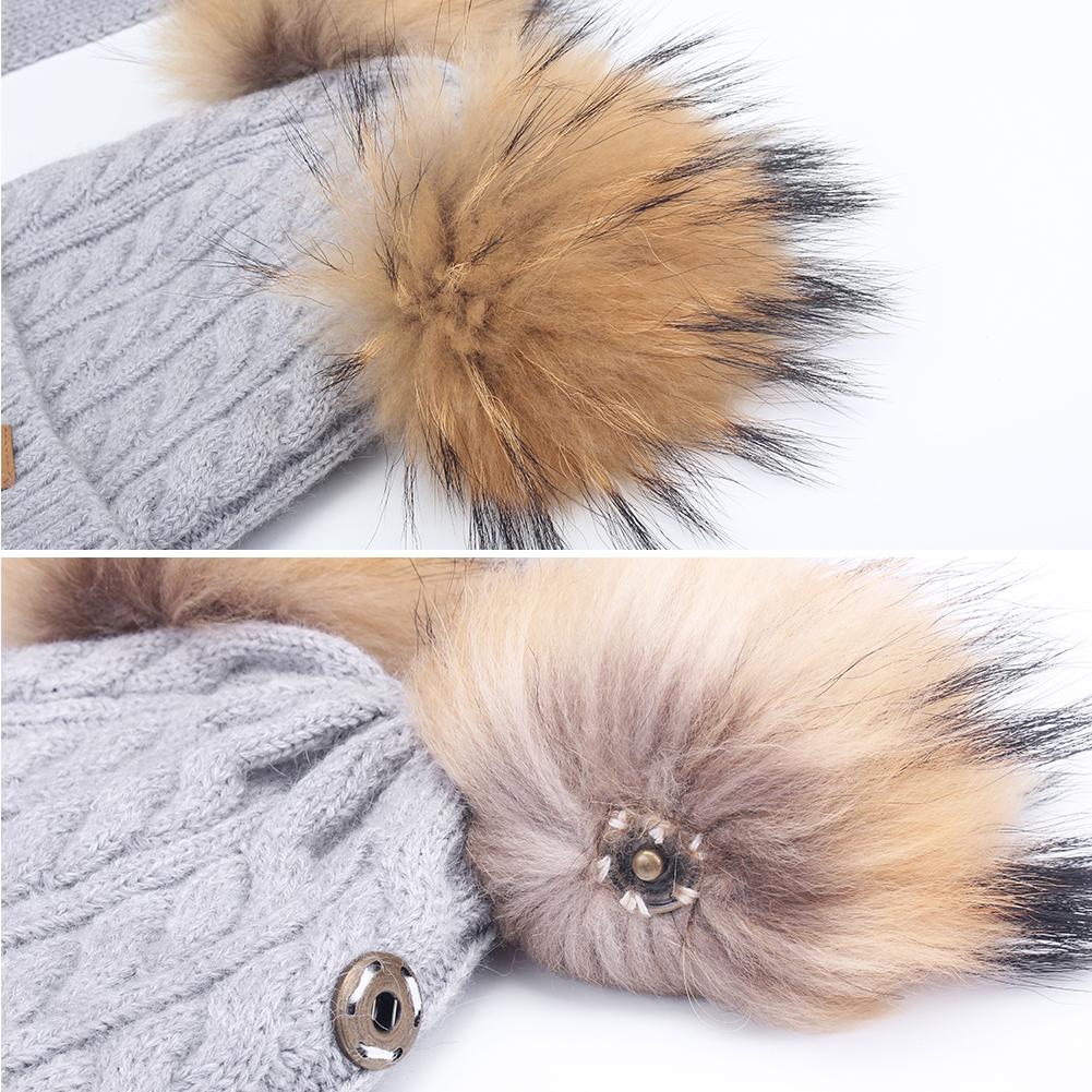 This pom beanie is knit in natural and colorful colors and with the Furtalk logo, and two detachable real fur poms.
