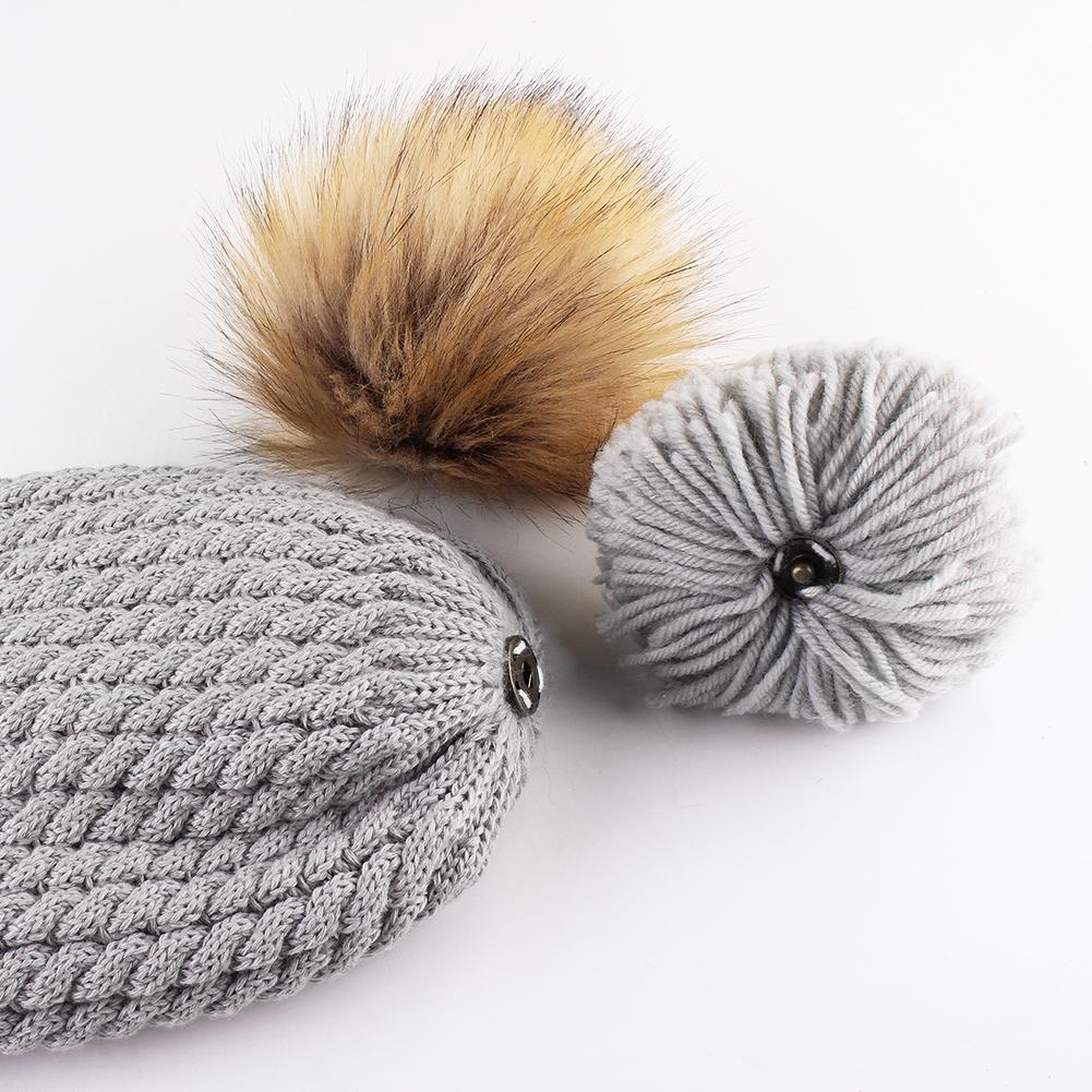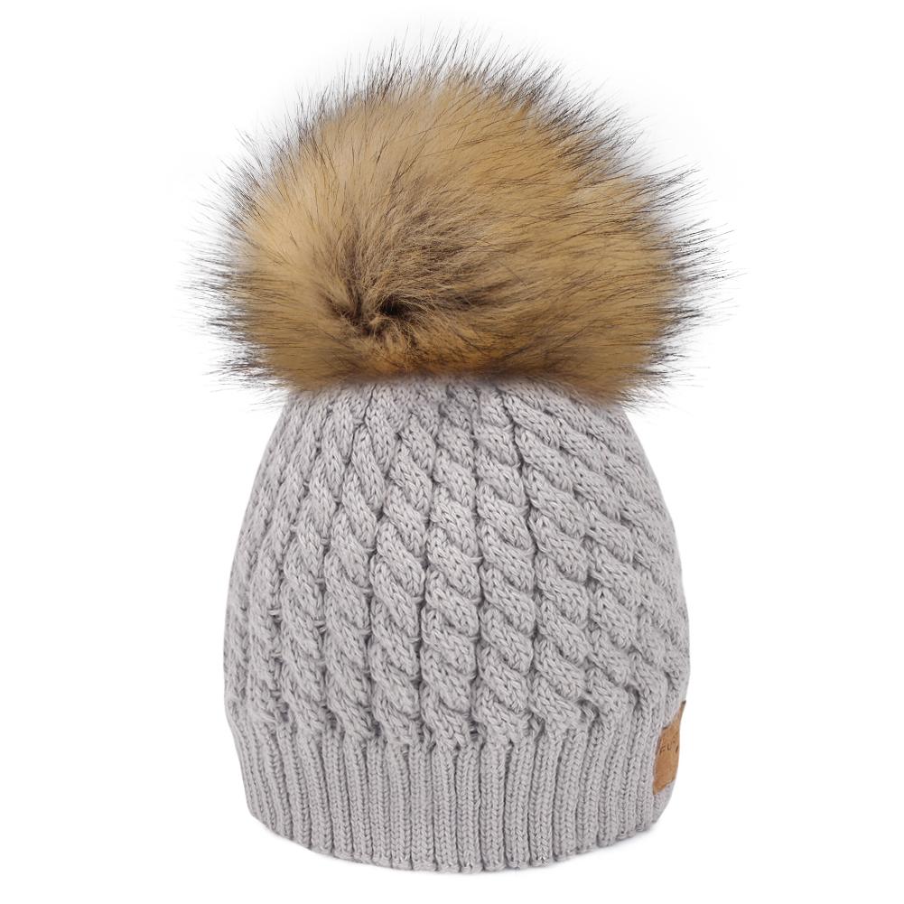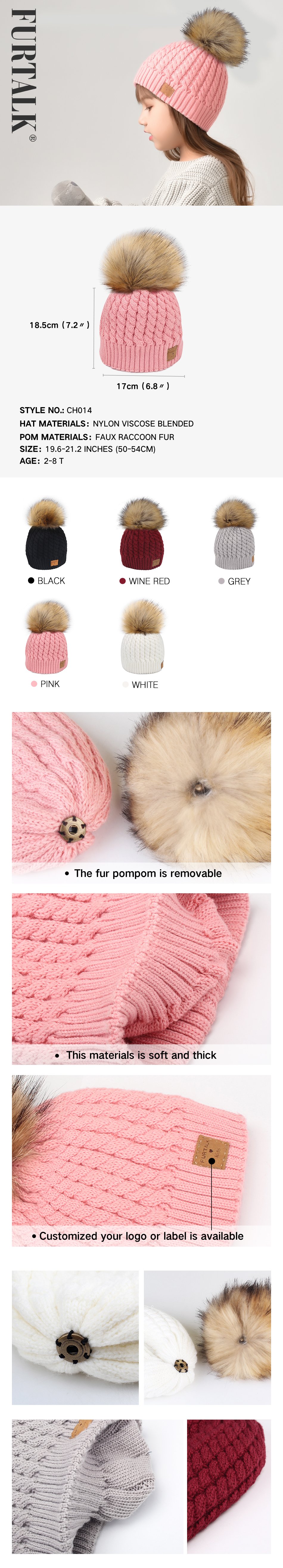 This cuffed pom beanie is knit in natural and colorful colors and with the Furtalk logo, and one detachable faux fur poms.