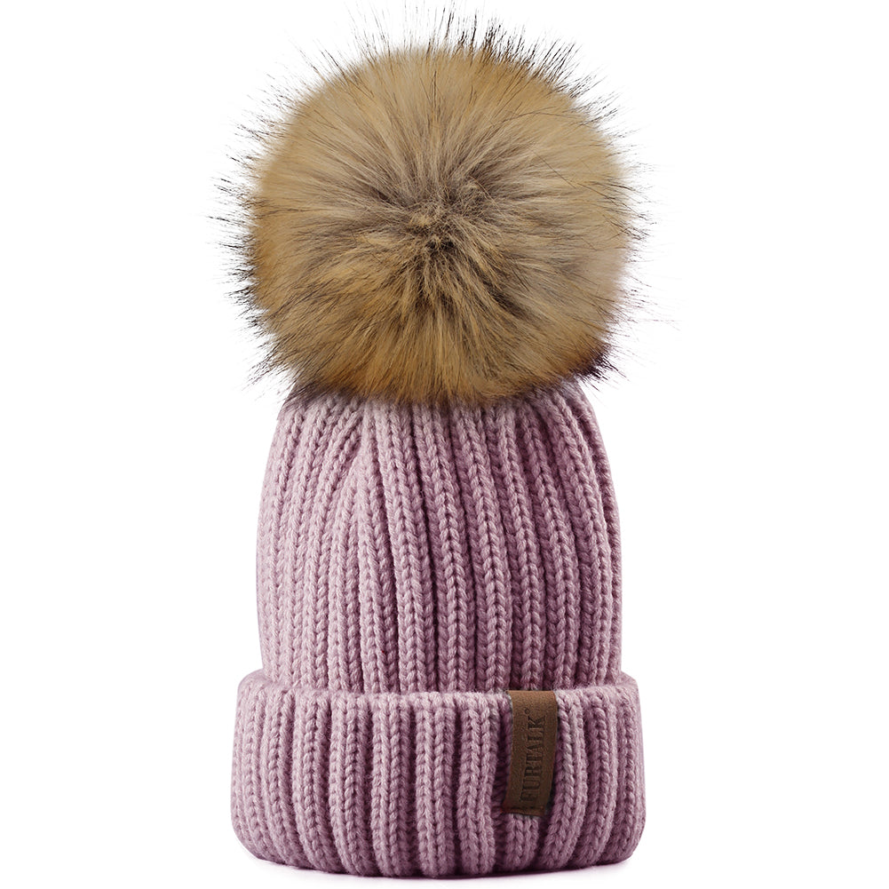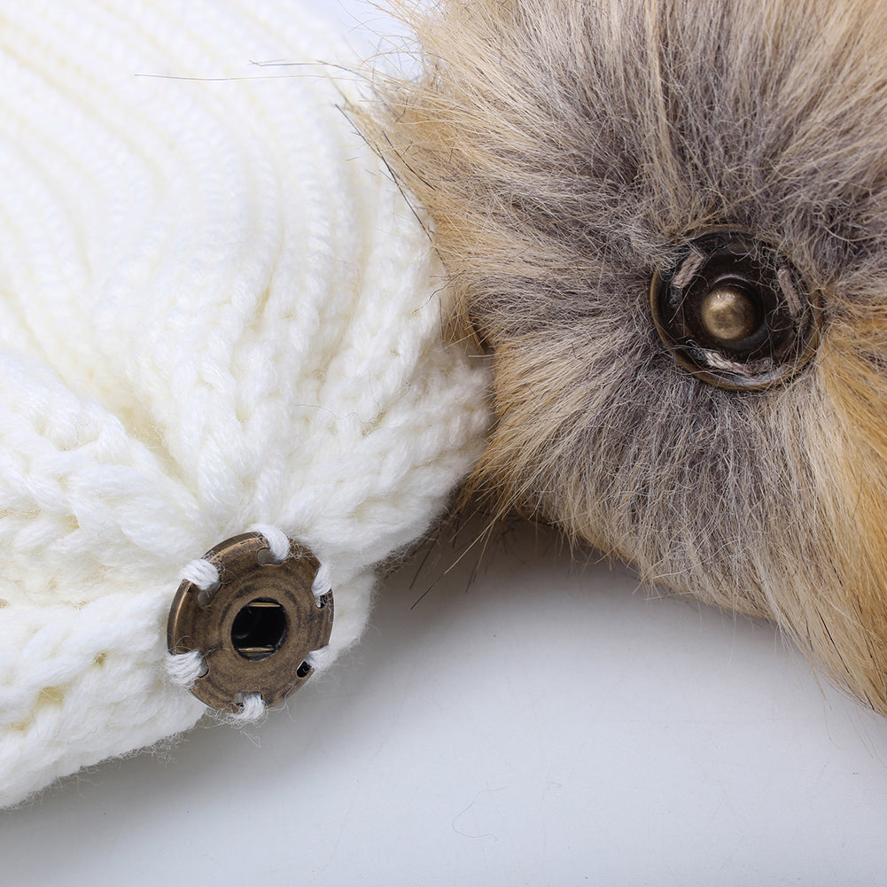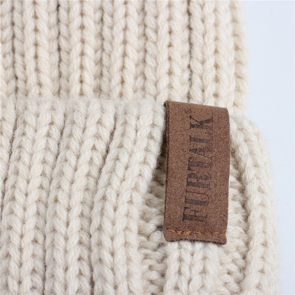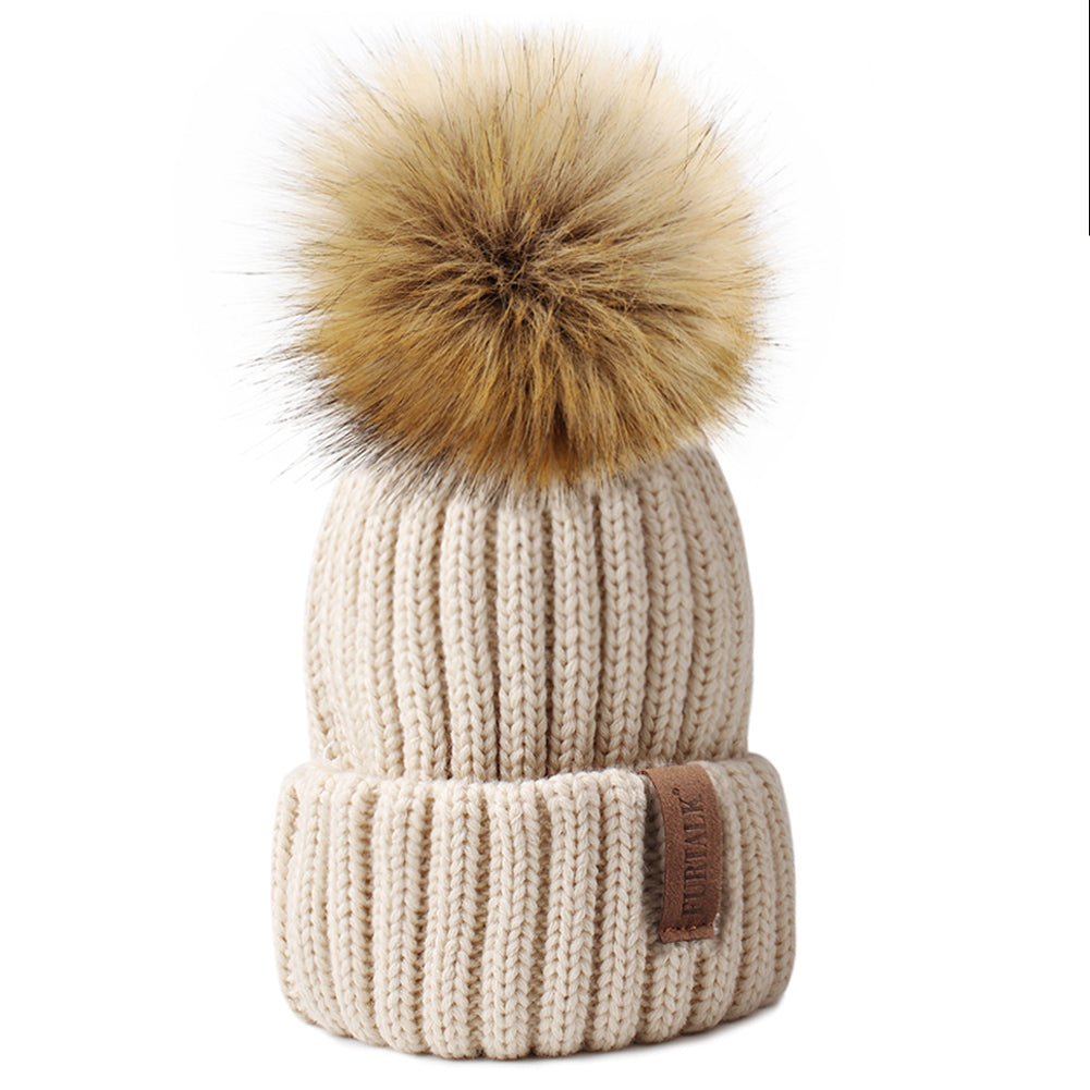 This cuffed pom beanie is knit in natural and colorful colors and with the Furtalk logo, and one detachable faux fur poms.